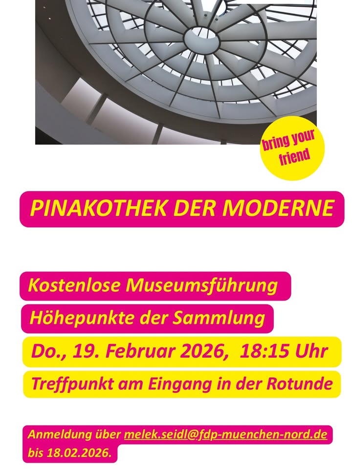 Lerne München näher kennen! 💛 ⭐️ Am 19. Februar 2026 findet eine kostenlose Kunstführung in der Pinakothek der Moderne statt. Von 18:15 bis 19:45 Uhr entdecken wir gemeinsam die Höhepunkte eines der spannendsten Museen der Welt. Eingeladen ist jede / jeder Interessierte. Freue Dich auf weltberühmte Werke, neue Blickwinkel und einen besonderen Abend.