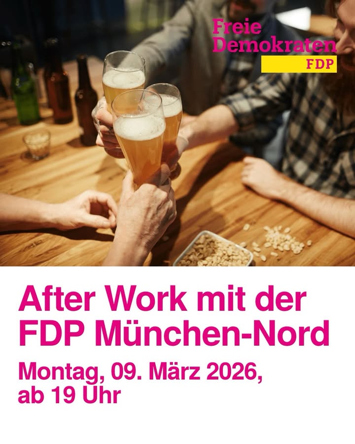 After-Work mit der FDP München-Nord 💛 🗓️ Montag, 09.03.2026 🕖 19:00 Uhr 📍 Gaststätte Scheidegger (Bauerstraße 16, 80796 München) Kommt gerne vorbei - diskutiert mit uns und lernt die FDP München-Nord kennen. Wir freuen uns auf euch! Mitglieder sowie Interessierte sind herzlich willkommen! 😊 #fdp #fdpmuenchennord #afterwork #networking #PolitischerStammtisch